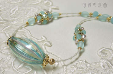 チェーン部分はマットクリスタルカラーの編みパーツ、アクアブルーのナツメビーズ、