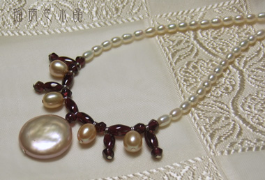 フリンジ部分はクリーム色の大粒パールとガーネットです。