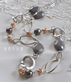 コンテンポラリーのパールビーズ、メタルパーツのロングネックレスです。