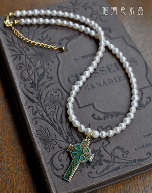粒の揃った美しい淡水パールに、グリーンのエナメル加工が施された