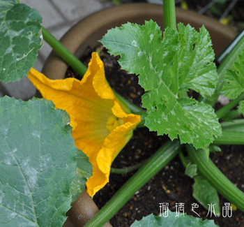 先日植えたズッキーニの苗は日々成長し、とうとう今朝最初の花が咲きました。