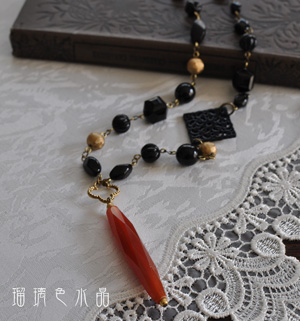 トップに下げたのは、こっくりとした赤茶のレッドアゲートのロングチューブ。