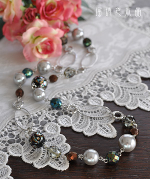 デカールビーズという黒地に複雑な模様のついたビーズや薄グレーのパールビーズ、