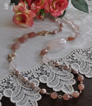 色々な形のローズクォーツとモスコバイト、オーキッドピンクの淡水パールを