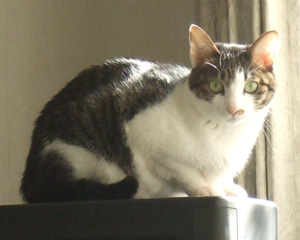 午前中は陽だまりのテレビの上がお気に入りの場所です。