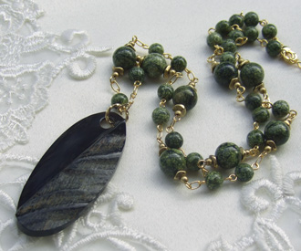 チェーン部分はロシアンサーペンティンやメタルパーツを、留め金まで繋いでいます。