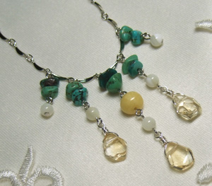 ターコイズのチップにMOPラウンド、真ん中のミルキーイエローの石は