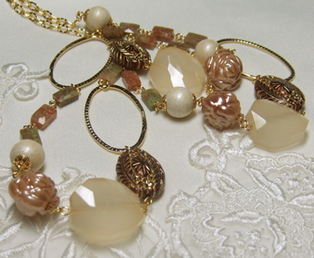 凝った模様のドイツ製樹脂ビーズやウッドビーズ、薔薇パーツなども添えています。