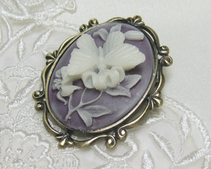 落ち着いたパープルの地にオフホワイトで百合と蝶が立体的に・・・