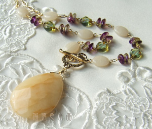 チェーン部分は薄いクリーム色とグリーンのチェコビーズと、オリーブとパープルの