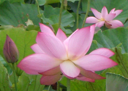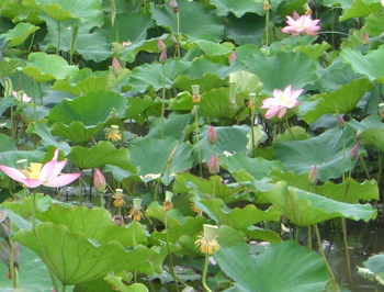 広いハス園にはたくさんの花が咲き、カメラを持って写真を撮りに来ている人などもいて
