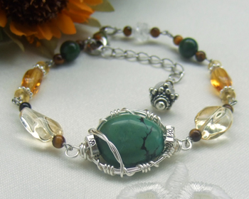 真ん中のターコイズにはシルバーパーツを組み込んだワイヤーワークが施され、