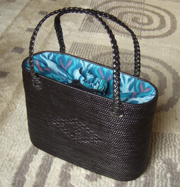 アタの黒い色も素敵ですが、中の布、バリのイカットの色合いにも惹かれました。