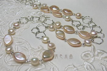 自然色ピーチのマーキスと、ボタン型のホワイトのパールのロングネックレス。