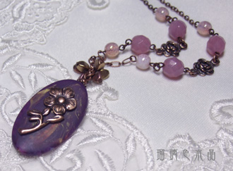 綺麗なパープルの樹脂オーバルにお花のメタルを添え、メタルっぽい