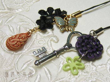 上の方はアンティークテイストのちょうちょのチャームに黒いレースを添えて、