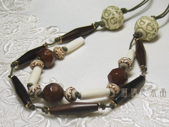 内側の連はボーンビーズや樹脂ビーズで、外側の連はウッドビーズです。