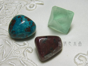 青い石はクリソコラ。赤い石はルビー。緑はグリーンフローライトです。