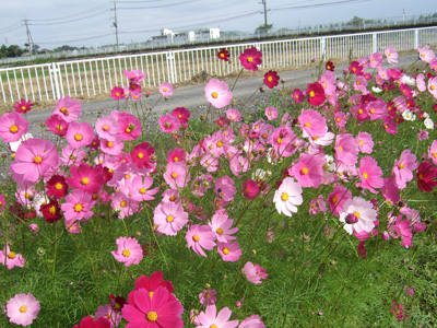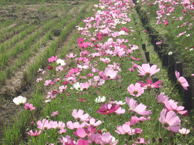 田んぼのあぜ道に植えられたコスモスがとても綺麗でした。