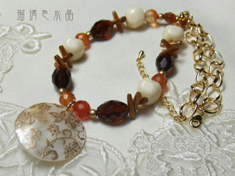 シェルに更紗風の繊細な模様がプリントされたパーツとカーネリアンのネックレス。