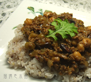 たまねぎのみじん切りをよく炒め、さらにひき肉とお野菜(今日はなすですが