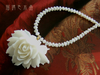 樹脂の薔薇パーツと小さな芥子の淡水パールのネックレス。