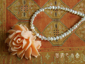 こちらはピーチの薔薇に淡水パールのチェーンを使用しています。