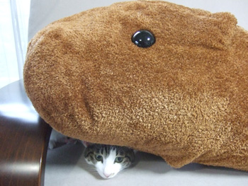 大きなカピバラの縫いぐるみを載せたら、狭い空間が気に入ったみたいで、