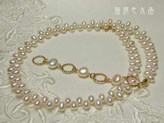 淡水パールのネックレスはサイドにホールの開いたクレオを使用したので