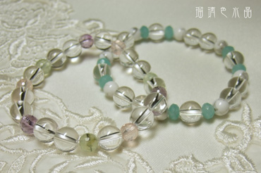 左側は水晶ラウンドにプレナイト、ローズクォーツ、アメジストの
