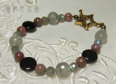 グレークラウディクォーツとラブラドライト、オニキス、ピンクトルマリンMIXです