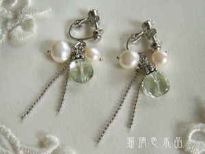 淡水パールのボタンとグリーンアメジストのピアスです。
