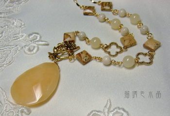 まず、柔らかなカットが入ったイエロージェイドドロップのネックレスです。