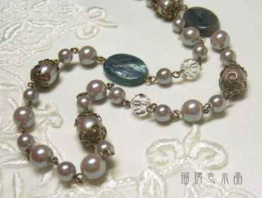くすんだようなブルーが、時代を経てきたようなモーブカラーのパールにマッチして