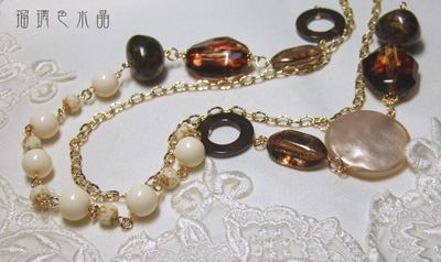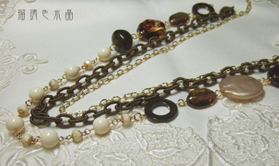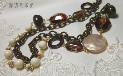 こちらはブロンズの糸巻きチェーンと、樹脂ビーズ、シェルパーツ、チェコビーズ等を