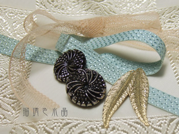 黒にシルバーの模様が美しいボタンやマットゴールドのリーフパーツ、